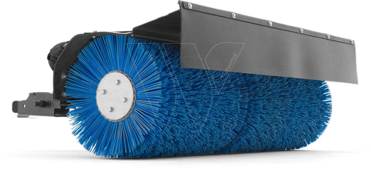 Hydraulisch verstelbare, roterende borstel voor het vegen van bladeren, grind, sneeuw enz. Asaandrijving met conische tandwielen en ketting aandrijving. Twee goed volgende ondersteunende achterwielen.