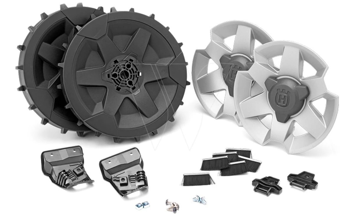 Kit bevat profielwielen en wielborstels voor uitstekende tractie op ruige en hellende gazons.